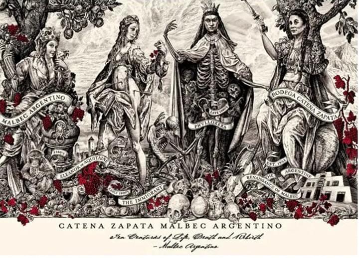四位女性人物代表了葡萄歷史上的不同里程碑。阿基坦的埃莉諾代表了馬爾貝克的誕生。她是一種強烈的舊世界氣息,徘徊在卡奧爾的橋上,馬爾貝克在這裡發揮了自己的角色。其次,移民象徵著前往新世界的運動以及將歐洲與美洲連接起來的未知探險家和冒險家。根瘤蚜象徵著馬爾貝克在舊大陸的死亡,這使得它在新大陸得以重生。最後,還有以 Adrianna Catena 為代表的 Catena Zapata 酒莊,她描繪了出生、大地和母性,分享新世界的財富。